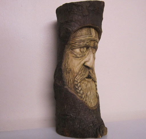 Philip is carved from a Sycamore log 9" tall by 3" diameter. The carving is 5 1/4" long by 3" wide. It's finished in Danish Oil with a brown oak stain. He is both wall and shelf standing. There are runes burnt into the top depicting his name.